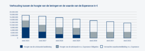 Om de balansverhouding gezond te houden en de risico’s die met investeren in obligaties samenhangen te minimaliseren, wordt er in de komende jaren gewoon afgelost op de banklening. In de volgende grafiek is weergegeven hoe de hoogte van de nog uitstaande banklening en de nog uitstaande m.s. Esperance Obligaties met de rente van 7,5% zich ten opzichte van de verwachte waardeontwikkeling blijven ontwikkelen. We gaan daarbij uit van een technische levensduur van containerfeeder schepen van 30 jaar.